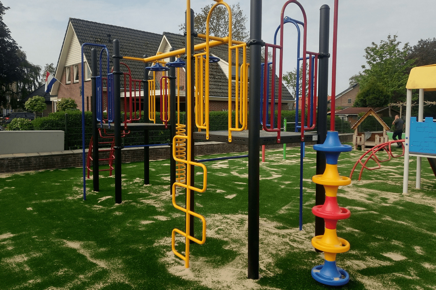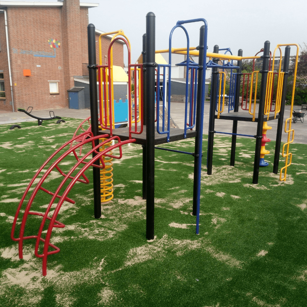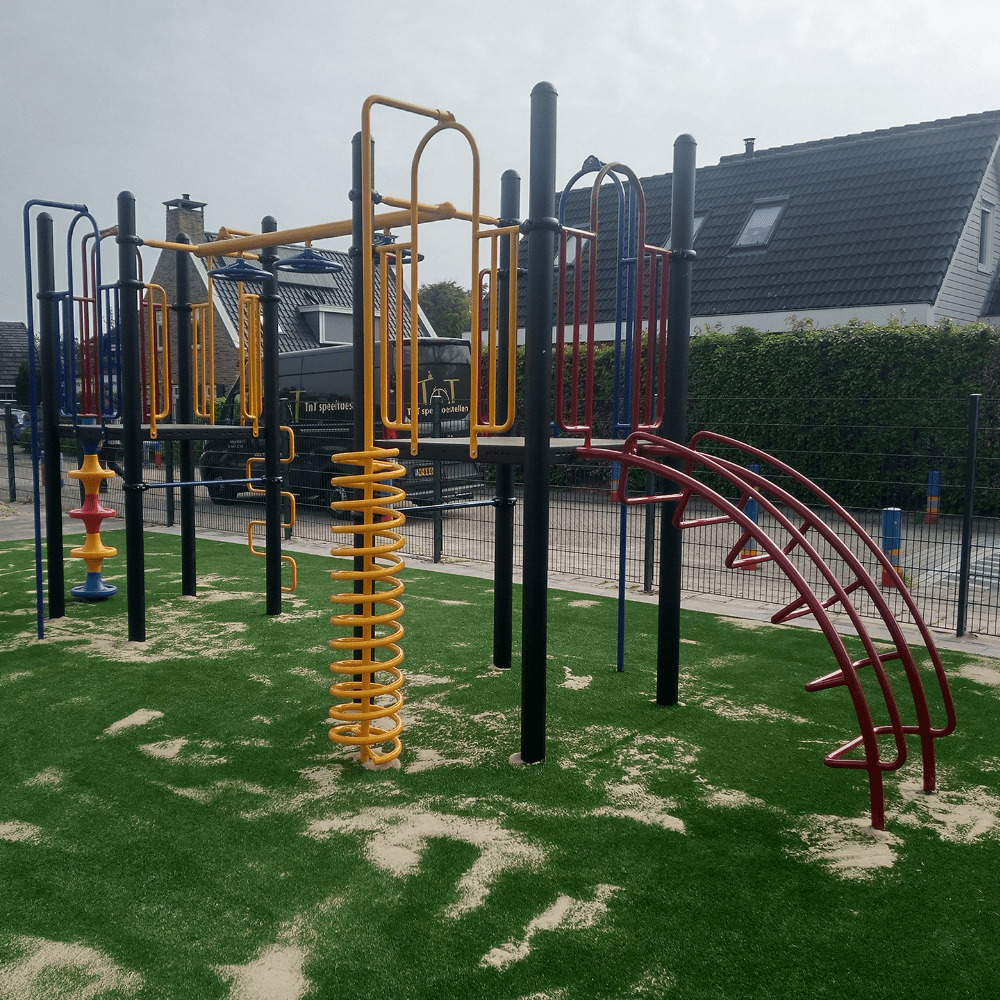 De St. Jacobus is de enige school in het kleine dorpje Valburg, hetgeen betekent dat vrijwel alle kinderen hier naar school gaan en dus spelen. Het nieuwe combinatietoestel dat we mochten plaatsen, is een uitdagend speeltoestel dat uitstekend past op het schoolplein. Het is met name geschikt voor de hogere groepen van de basisschool. Dit komt omdat er is gekozen voor verschillende klimelementen naar de platformen en niet voor een veilige trap met leuningen voor de jongere kinderen. De primaire kleuren geel, rood en blauw, in combinatie met de zwarte staanders en het groene kunstgras maken van dit speeltoestel een mooie blikvanger op deze speelplek.