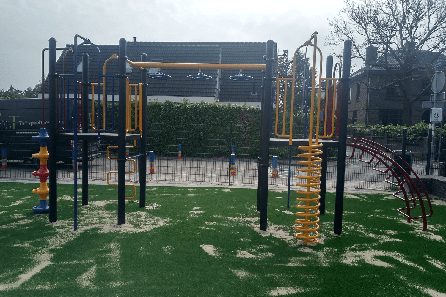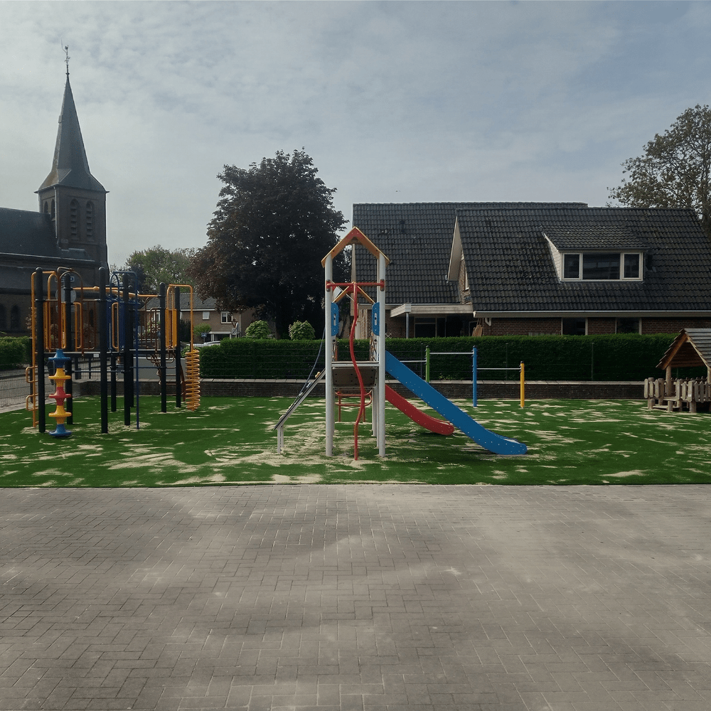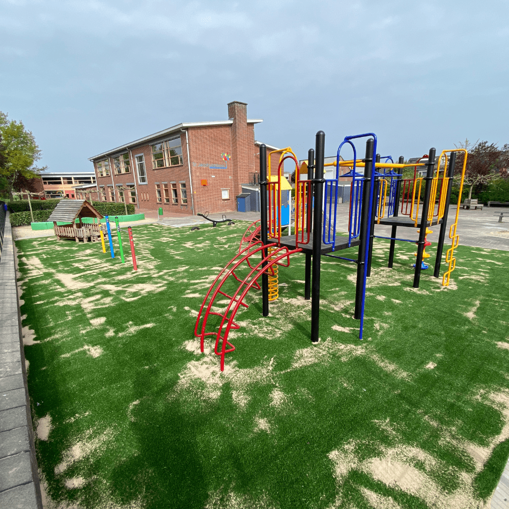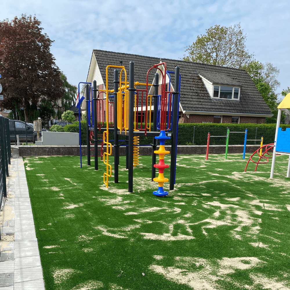De gehele speelplek is voorzien van nieuw kunstgras, in totaal maar liefst 235 m2. Om aan de juiste norm van valdemping onder een professioneel speeltoestel te voldoen, moet rekening worden gehouden met de valhoogte van een speeltoestel. Bij het nieuwe klimtoestel was de kritische valhoogte 170 cm. Kunstgras heeft van zichzelf geen valdempende eigenschappen maar voldoet in combinatie met een schokabsorberende ondergrond wel aan de Europese norm EN-1177 voor valdemping. Dit betekende dat er kunstgras moest worden neergelegd met een shockpad van 35 mm hoogte eronder om de val van kinderen goed op te kunnen vangen. Het kunstgras is daarna weer ingestrooid met zand. Dit is voor een beter behoud van de grasmat en de vezels van het kunstgras worden minder snel platgelopen.