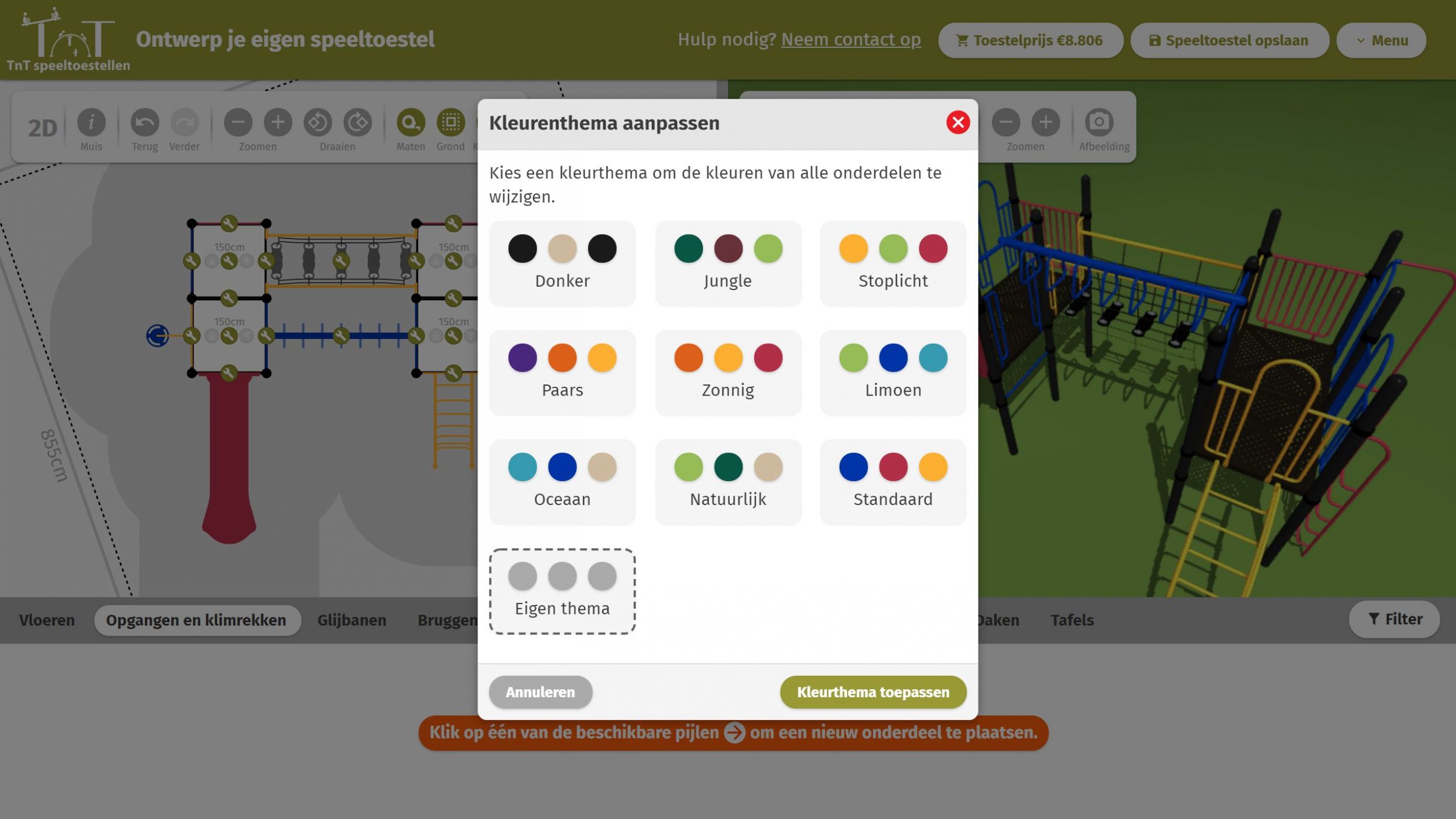 Van vrijwel alle speelelementen van de speeltoestellen in de TnT 3D-ontwerper zijn de kleuren zelf aan te passen. Door het toevoegen van kleurenthema’s maken we het je nog makkelijker. Je kunt nu sneller kleuraanpassingen maken en hoeft niet meer alle afzonderlijk speelelementen te wijzigen. De kleurenthema’s zijn afgestemd op favoriete kleurcombinaties of kleuren die goed bij elkaar passen. Maar uiteraard blijf je vrij om je eigen kleurencombinaties te gebruiken.